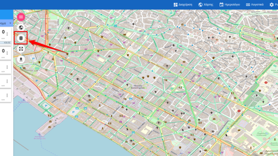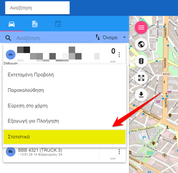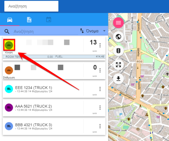 Επίπεδο εστίασης για να περιλαμβάνονται όλα τα οχήματα του στόλου στον χάρτη, εστίαση σε συγκεκριμένο όχημα και zoom σε συγκεκριμένο όχημα